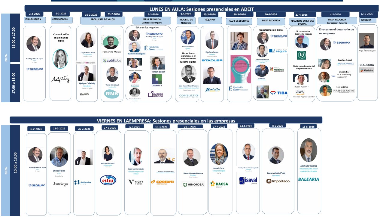 Este curso, en su 27ª edición, se desarrollará desde el lunes 2 de febrero de 2026 hasta el martes 12 de mayo de 2026 en sesiones los lunes por la tarde de 16.00 a 16.00 h. de forma presencial en ADEIT y los viernes por la mañana se realizará la visita a las empresas.
